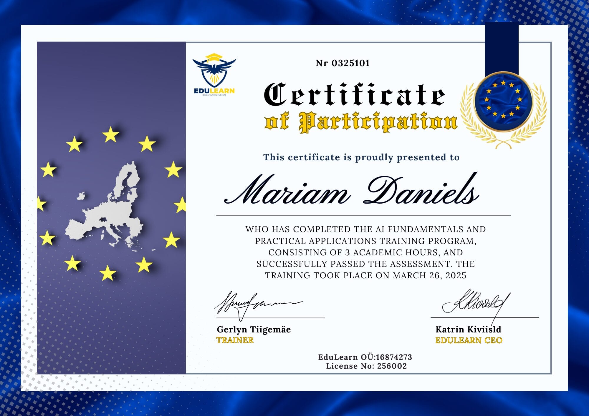 Earn your EU-accredited AI Training Certification and showcase your expertise in Artificial Intelligence and Machine Learning. This certification is awarded upon successful completion of our AI training program, equipping you with the knowledge and skills required for the future of work.